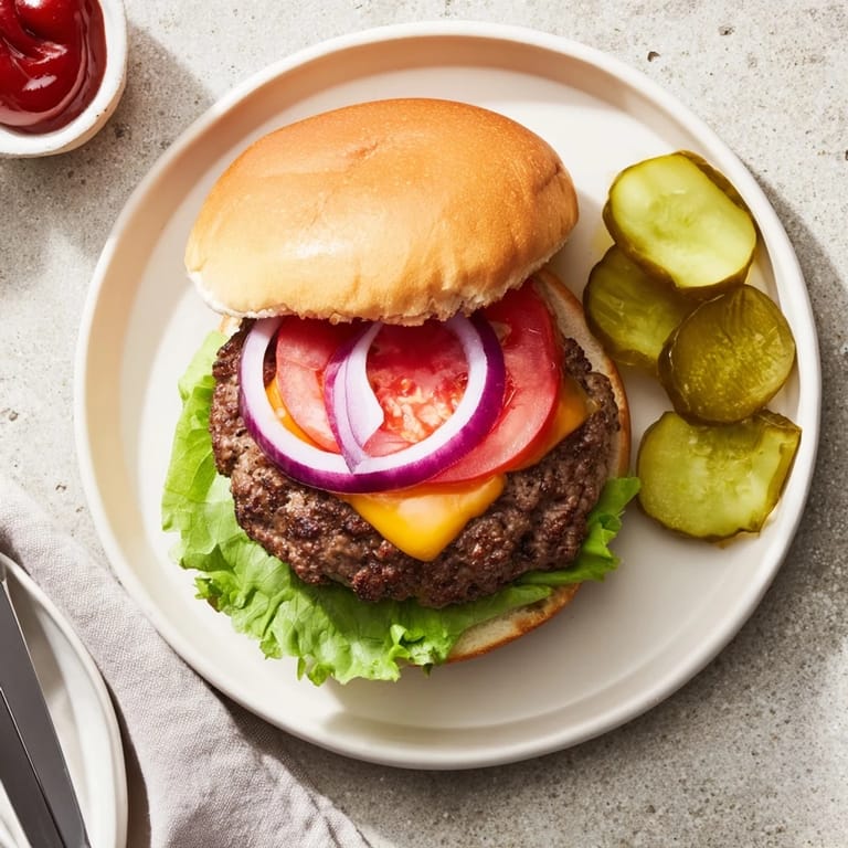 - Layer lettuce first to protect the bun, then patty with melted cheese, followed by tomato, onion, and pickles.