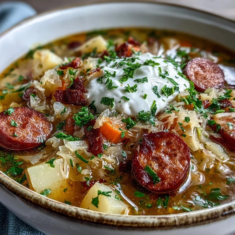 Save My neighbor brought over a jar of homemade sauerkraut last winter with this cryptic instruction: make soup with it. I stood in my kitchen holding the jar, skeptical but curious, and realized I'd never actually tasted fermented cabbage in a proper soup before. That first bowl changed everything—the tanginess hit different when it was warm, rounded out by smoky bacon and soft potatoes. It became the soup I craved on grey afternoons, the kind that feels both nourishing and indulgent.